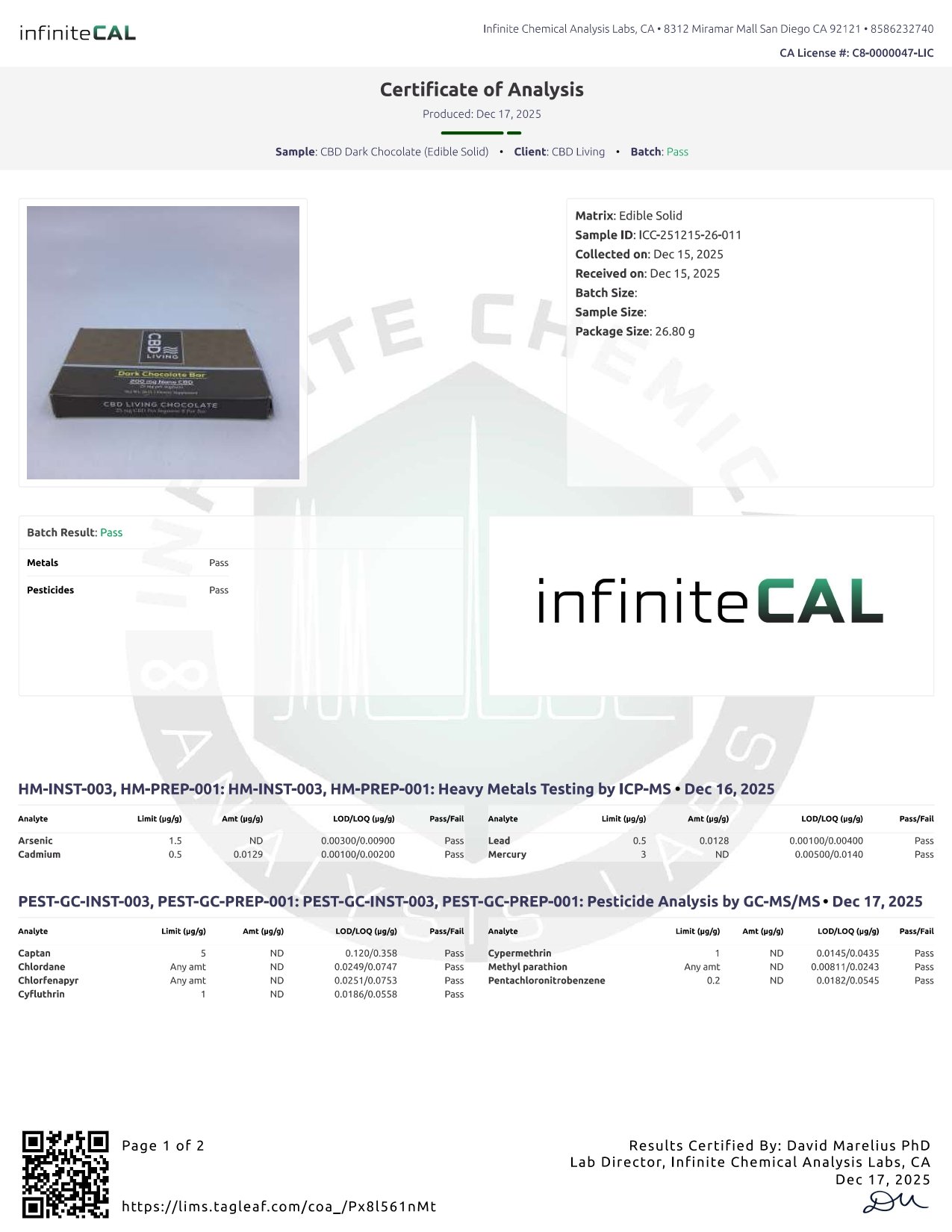 Ingredients used: Proprietary Broad Spectrum Nano Hemp Extract (aerial parts) 25 mg (Cannabidiol/CBD), Sugar, Palm Kernel Oil, Nonfat Dry Milk, Cocoa, Soy Lecithin, Salt.